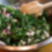Spicy Kale Salad with Tahini Sauce, Red Peppers, Nutritional Yeast and Cranberries.